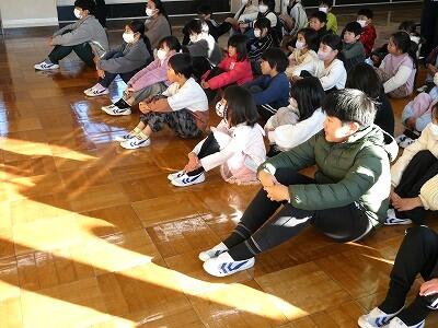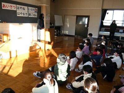 本日、1校時にランチルームで冬休み前集会が行われました。校長先生から、冬休みに向けて3つのお話がありました。