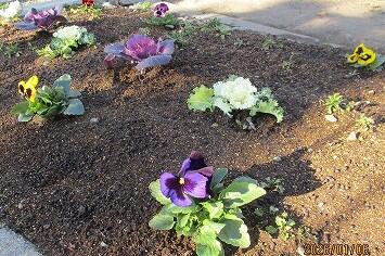 正門付近の花壇に、用務員さんがパンジーや葉ボタンを植えていました。