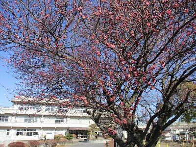 春のような暖かさに、正門の紅梅もすっかり色づきました。