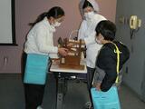 次に糸車や綿の種を取る作業などを体験し、スライドを見ました。実際に糸車を動かしていただいたり、綿と種を区別する作業を見せていただきました。スライドでは馬車や木造校舎時代の栃本小、唐沢山城跡トンネルの様子を見ることができました。汽車の模型を動かす体験ができました。
