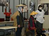 民具体験学習では、食事に使われた道具類をはじめとするたくさんの道具を紹介され、使う体験もしました。野良着を着る体験をすることもできました。外では、手押しポンプの体験もできました。