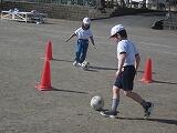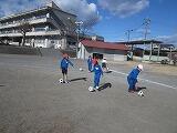 1・2年の体育の授業で、サッカーをしました。パス回しやドリブルの練習をして、「両足で蹴ると速くドリブルができるよ。」などと教え合いながら活動することができました。